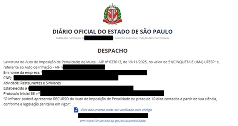 Primeiramente, a penalidade será publicada no diário oficial, sendo, no exemplo, a publicação feita no diário oficial estadual. Para saber mais detalhes sobre o motivo da multa, você poderá acessar o auto de infração, de número declarado na publicação, apesar de geralmente já saber o motivo, uma vez que a fiscalização geralmente informa a empresa sobre as irregularidades constatadas.